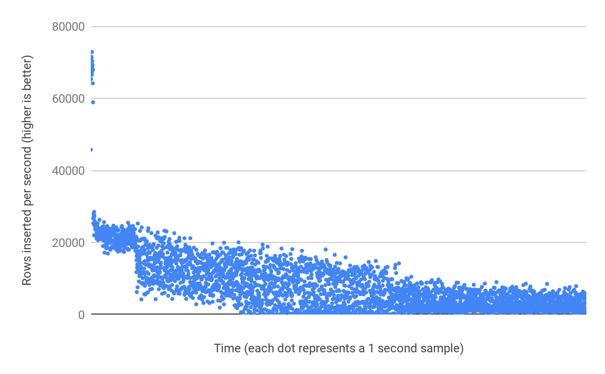 Table A only lost 13% of its insert performance when the buffer pool was lowered from 16GB to 128MB. To prove that there is not a clear “maximum number of rows” limit, let's now extend the test run time to 5 hours. After inserting almost 463 million rows, we can see our 376GB table still retains most of its insert performance:
