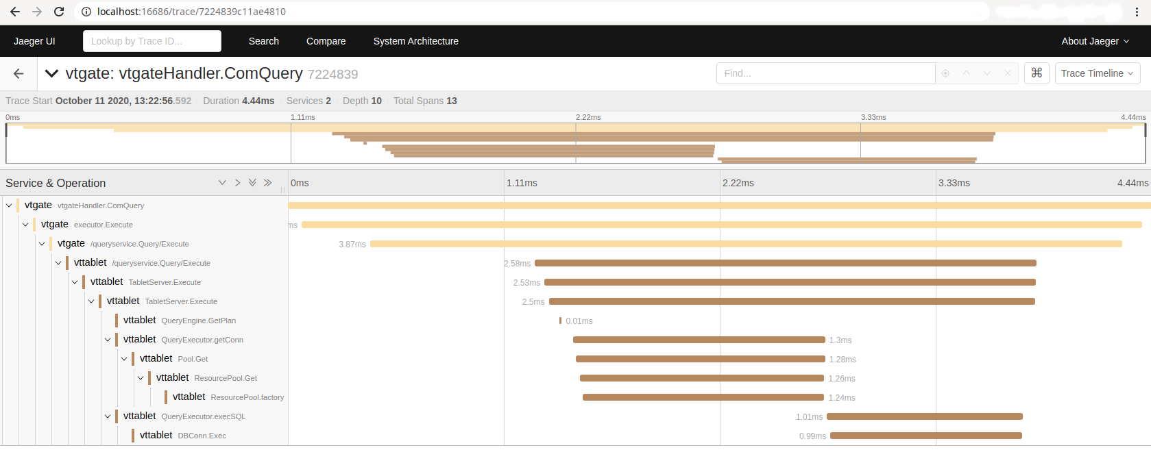 parts of the code as the query moves through vtgate and the vttablet(s) involved in the query. An example would look something like this: